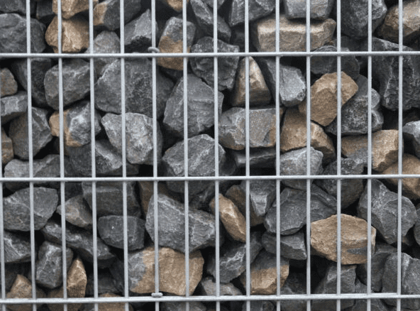 Een verstevigde bodemplaat draagt de verticale panelen die voorzien zijn van dubbele horizontale staaldraad. Intern worden nog verstevigingen aangebracht om elke vervorming tegen te gaan. Op een trilplaat worden de schanskorven gevuld met beige of grijze vorstbestendige rotsen (8/15 cm).